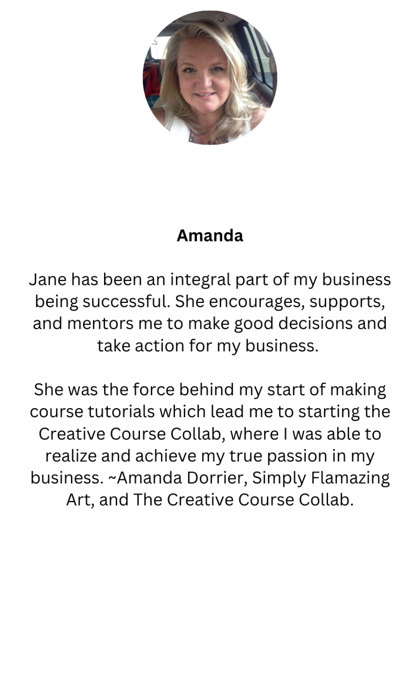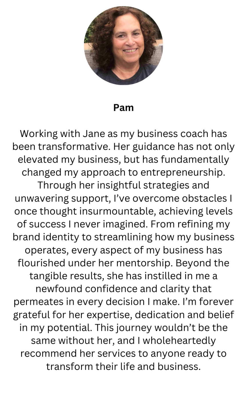 "Working with Jane as my business coach has been transformative. Her guidance has not only elevated my business, but has fundamentally changed my approach to entrepreneurship. Through her insightful strategies and unwavering support, I’ve overcome obstacles I once thought insurmountable, achieving levels of success I never imagined. From refining my brand identity to streamlining how my business operates, every aspect of my business has flourished under her mentorship. Beyond the tangible results, she has instilled in me a newfound confidence and clarity that permeates in every decision I make. I’m forever grateful for her expertise, dedication and belief in my potential. This journey wouldn’t be the same without her, and I wholeheartedly recommend her services to anyone ready to transform their life and business."